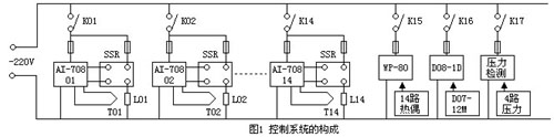 溫度控制由AI708智能調(diào)節(jié)器實(shí)現(xiàn).具有體積小,可靠性高,抗干擾能力強(qiáng)等優(yōu)點(diǎn),并有多種控制方式供選擇,具備RS232/485接口,可構(gòu)成小型(DCS)集散控制系統(tǒng).儀表輸入采用K型熱偶,輸出采用SSR驅(qū)動(dòng)模塊,控溫元件采用20A的SSR固態(tài)繼電器.反應(yīng)器的內(nèi)溫檢測(cè)選用WP-80 16點(diǎn)溫度巡檢儀,可輸入多種分度號(hào)的熱電偶信號(hào),能實(shí)現(xiàn)自動(dòng)冷端補(bǔ)償,并有自穩(wěn)零功能.流量控制選用D07-12M/ZM控制器,由D08-1D/ZM顯示儀實(shí)現(xiàn)流量顯示與設(shè)置,該儀表具有外加設(shè)定功能,可由計(jì)算機(jī)等外部設(shè)備提供設(shè)定值.壓力檢測(cè)選4臺(tái)壓力變送器,具有數(shù)字顯示功能.
